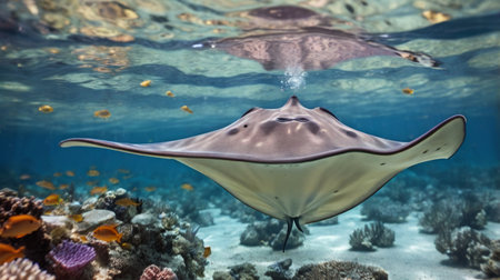 An impressive stingray gracefully swims near the surface of the ocean, its reflection mirroring on the water. Surrounded by other small fishes and a vibrant coral reef, this underwater scene is truly captivating. The stingray's smooth movement and the play of light create a peaceful underwater environment.