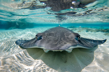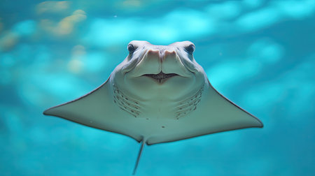 A captivating close-up of a stingray swimming gracefully underwater, showcasing its unique features and gentle demeanor in a serene aquatic environment.