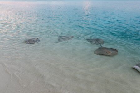 Stingrays swim in crystal clear water in Fulidhoo island beach, Maldives