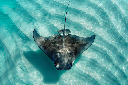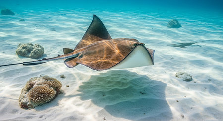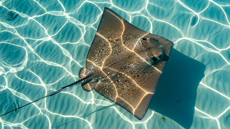 Graceful Stingray Gliding Over Sandy Seafloor in Crystal Clear Tropical Waters with Sunlight Reflections and Underwater Texture Showcasing Marine Life