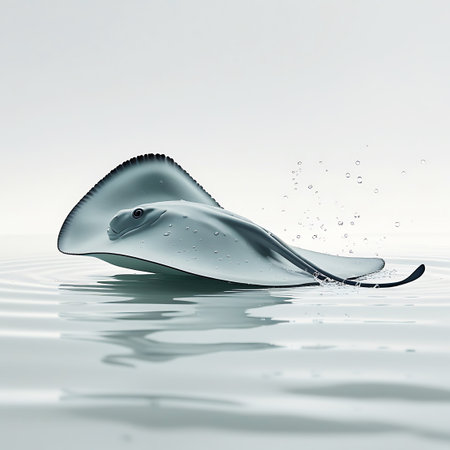 A grey stingray with its characteristic flat body and pointed tail is shown partially emerging from a rippling water surface. Small bubbles trail behind it, and its reflection is visible below. The clean, bright background and the gentle movement of the water create a serene and elegant visual.