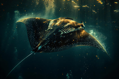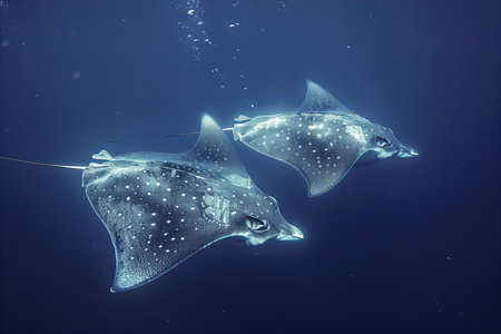 a school of rays swimming together, their flat bodies and flowing tails creating a mesmerizing display, created with generative ai