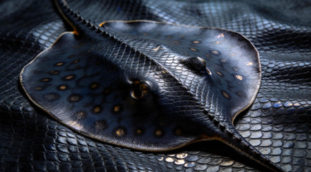 A creative digital illustration depicting Commercial digital stock art of shadowed dark shagreen stingray leather texture, pebbled exotic luxury, subtle embossed highlights, nautical elegance. This AI-generated artwork features unique visual elements suitable for various commercial and editorial applications. AI-generated illustration.