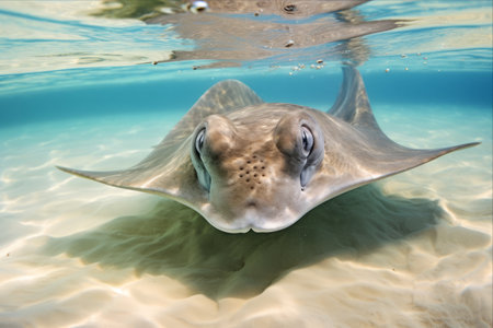 A close view of a stingray gliding over sandy bottom in clear turquoise waters. Generative AI
