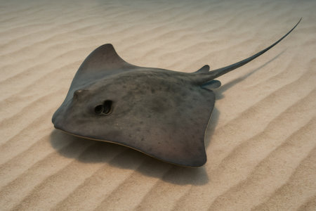 Graceful stingray lying still on the ocean floor, blending seamlessly with the ridged sand in its natural habitat