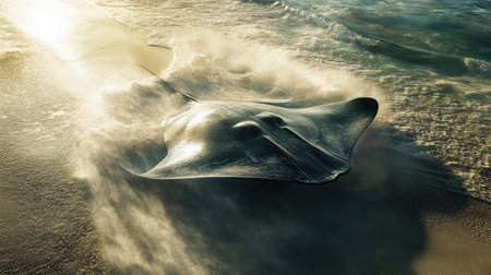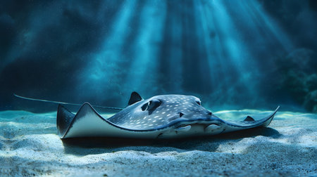 A magnificent stingray gracefully swims across the sandy ocean floor, illuminated by soft sunlight filtering through the water, showcasing the beauty of marine life.