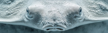 This macro shot captures the intricate details of a stingray's face, revealing its textures and eye structure. Set in an oceanic environment, the image highlights marine life.