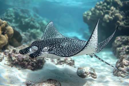 A majestic spotted eagle ray glides gracefully over a pristine white sandy seabed, bathed in tranquil turquoise waters. Its spotted pattern contrasts beautifully with the bright sand.