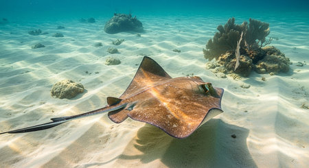 A stingray gliding just above the ocean floor, its flat body and long tail creating a smooth, flowing motion.