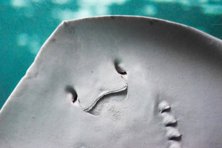 A close-up of a graceful stingray swimming gracefully, its lower body and mouth in blue water.