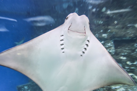 underwater photography sea stingray smiles swims on blue background