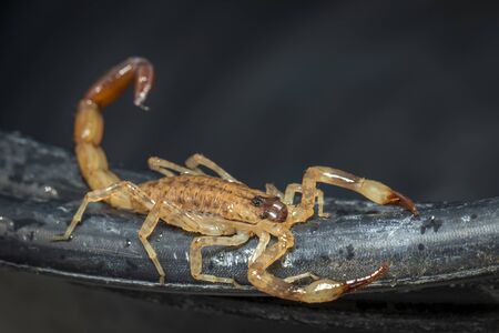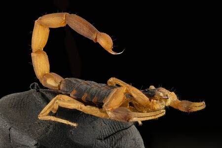 The Yellow with black Striped Bark Scorpion, arthropod Macro specimen, side