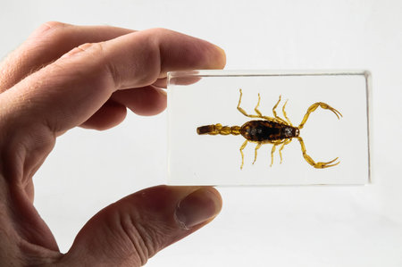 Pickled Golden Scorpion preserved in Formaldehyde on a White Background