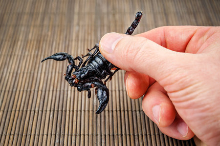 Asian black scorpion on white wooden background in Ubud, island Bali, Indonesia. Close up