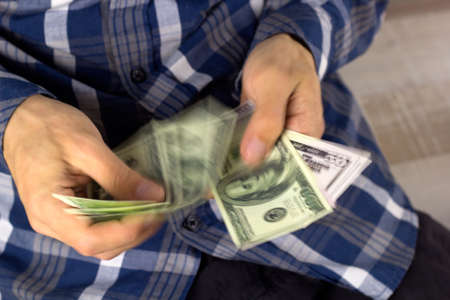 Male hands are counting 100 dollar bills on a dark background top view horizontal photo.