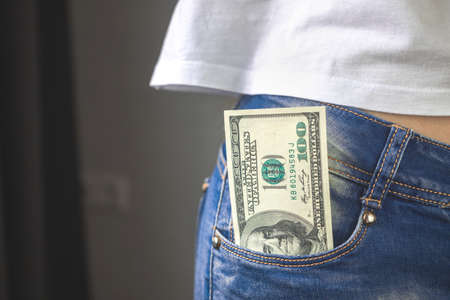 Dollars in pocket. Young woman with money in her denim jeans pocket. Concept of wealth