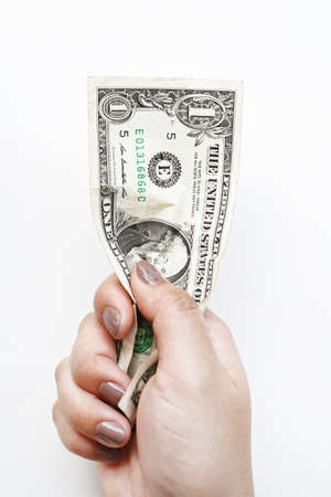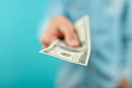 Hand giving dollar money, close-up. Hands holding a dollar bills on white background with copy space. Salary, earning and savings concept