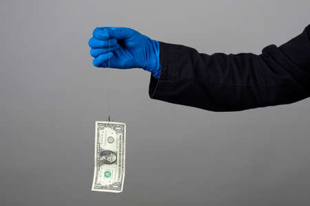 a gloved hand holds a thread with a fishing hook on which a one dollar bill is worn. lure with money