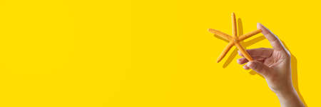 Female hand holding yellow starfish on the yellow background. Summer time of the rest