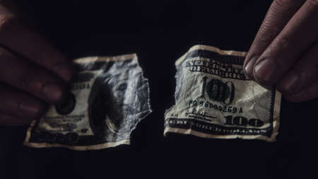 Man hands hold torn money US dollars on a black background, close-up. USA cash in the dirty hands of an american poor man on a dark background