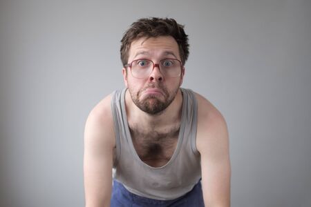 Young caucasian man in glasses is tired and exhausted. Studio shot. Negative facial emotion.