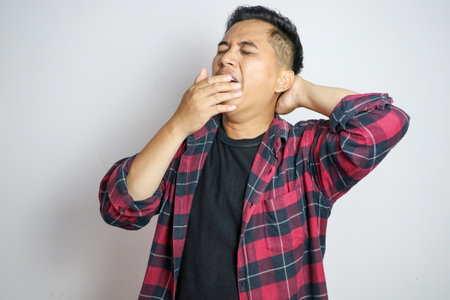 young Asian man with yawn face and sleepy on white background