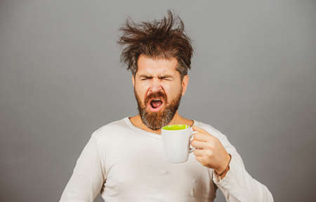 Man drinking coffee. Morning guy, wake up early in the morning on day, lifestyle daily concept. Sleepy shaggy guy in the morning.