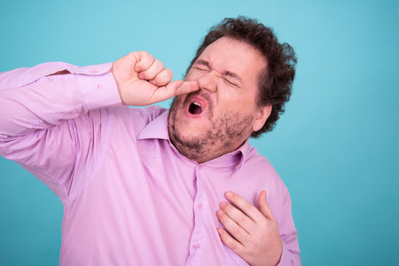 Fat man yawning and covering his mouth with his hand on blue background