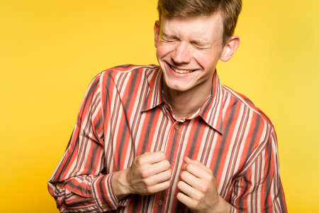 happiness enjoyment and laugh. man with a wide grin. portrait of a young guy on yellow background. emotion facial expression. feelings and people reaction.