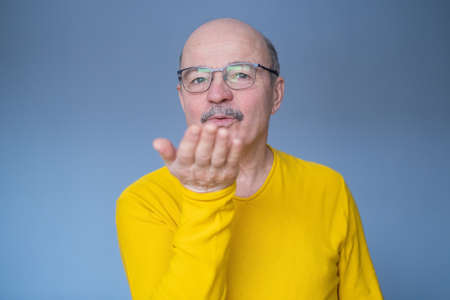 Senior man looking at the camera blowing a kiss with hand on air being lovely.