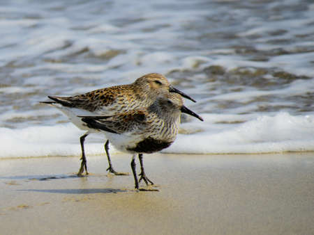 Couple of dunlin (calidris alpina) in Saler beach, Valencia, Spain