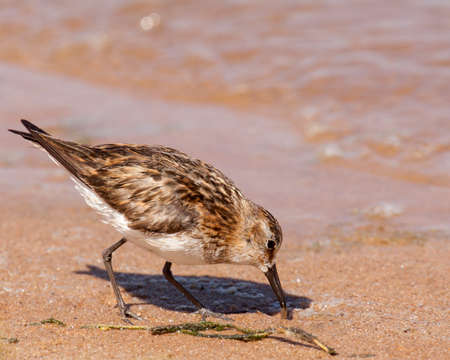 Dunlin or Calidris alpina, searching for food at sea shoreline, close-up portrait, selective focus, shallow DOF.