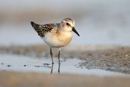 little stint (Calidris minuta) photographed close-up feeding on coastal sand in soft morning light