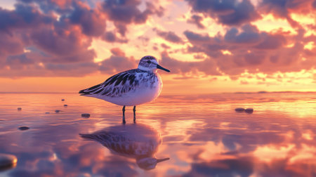A peaceful scene of a sanderling standing at the edge of a tide pool, the vibrant sunset sky reflected in the water.