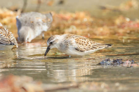 The little stint (Calidris minuta) feeding on shore.