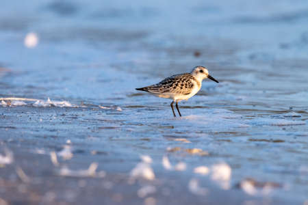 High key shot of a sanderling shore bird seeking food in the wash at the water's edge