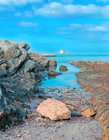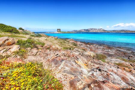 Stintino, turquoise sea water, coastline and tower. Sardinia, Italy