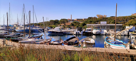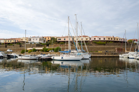 Stintino, Italy - September 13, 2023: Sailboats are moored along the quay in the port of Stintino, with residential buildings and a stone wall visible in the background under a cloudy sky.