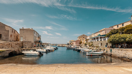 CENTURI, CORSICA - 10th JULY 2018. Fishing boats moored in the small harbour at Centuri on Cap Corse in Corsica surrounded by bars and restaurants
