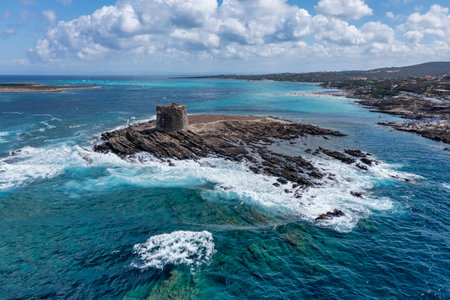 An aerial view of Torre della Pelosa, a sixteenth-century watchtower near Stintino and La Pelosa Beach in northwest Sardinia, Italy.