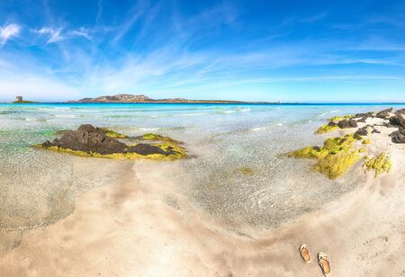 Sardinia la pelosa stintino panorama view from the beach coast on ancient tower turquise blue sea ocean blue sky background