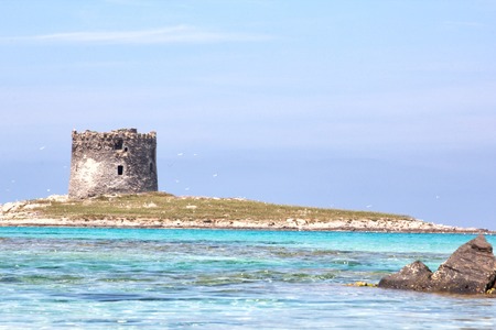 Ancient watchtower on small Island close to La Pelosa in Stintino on Sardinia island in Italy