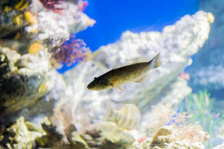 Beautiful underwater scenery in aquarium with blue fish. Tropical underwater life.