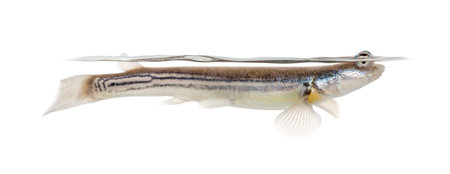 goby fish displays its distinctive features showcasing streamlined body and vibrant coloration captured in high detail against a pure white backdrop.