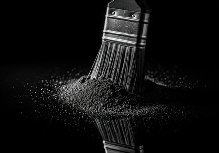 Paintbrush bristles pressing into a mound of fine black powder, possibly charcoal or pigment, creating a dramatic, low key studio composition with strong contrast and reflection.