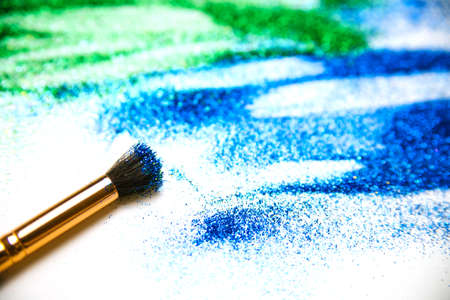 A professional makeup brush dipped in glittery eyeshadow, leaving a sparkling trail on the white surface.
