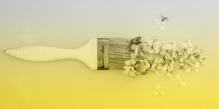 Demonstrating trendy colors 2021 - Gray and Yellow. Color of the year 2021. Illuminating, Ultimate gray. Paintbrush with flowers. Plant background