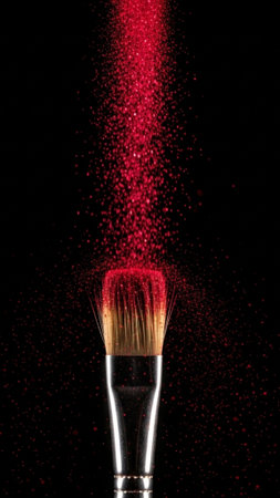 A striking makeup brush emerges from vibrant powder clouds, creating a colorful, artistic representation of beauty and creativity in a unique composition set against a captivating backdrop.