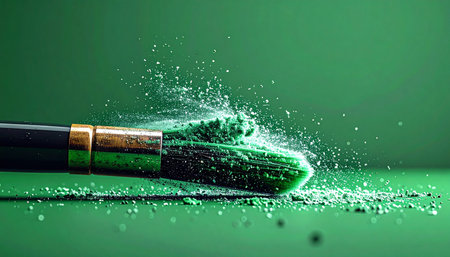 A dynamic, high-speed macro shot captures the moment a cosmetic brush releases a vibrant explosion of green eyeshadow pigment.