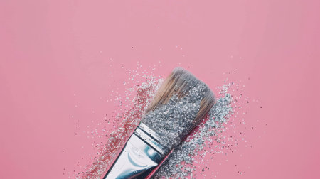 A makeup brush with silver glitter on the bristles is positioned on a pink background, with a scattering of glitter around it. The brush is positioned in the lower right corner of the frame, with the handle extending towards the bottom left.